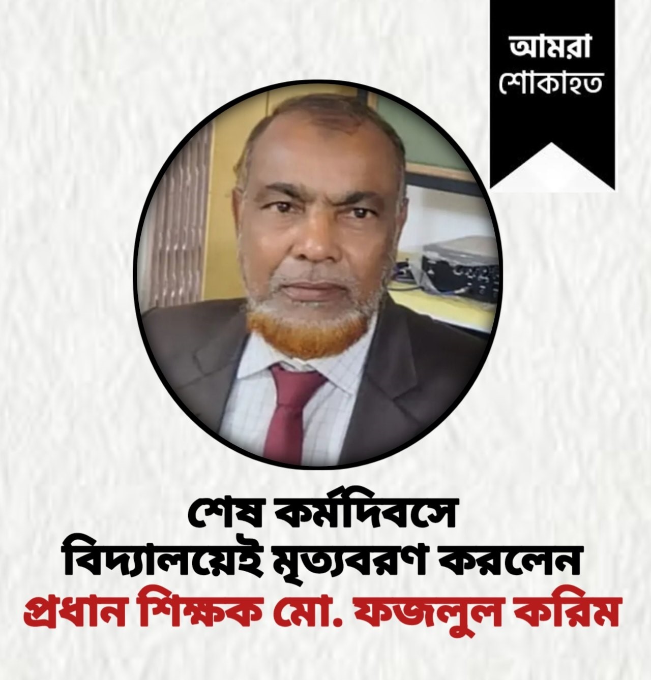 সিরাজগঞ্জের রায়গঞ্জে চাকরি জীবনের শেষ কর্মদিবসেই হৃদরোগে আক্রান্ত হয়ে মৃত্যুবরণ করেছেন মো. ফজলুল করিম (৬০) নামের এক শিক্ষক।