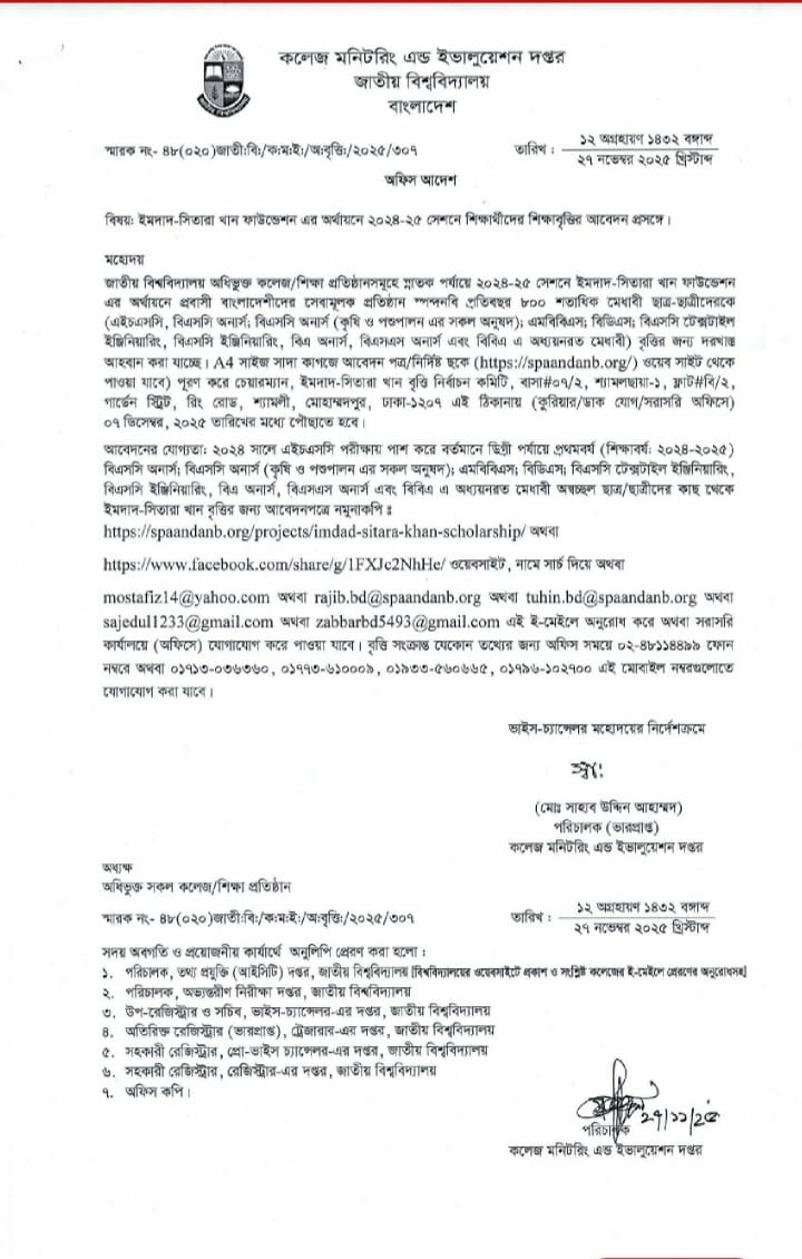 জাতীয় বিশ্ববিদ্যালয়ের অধিভুক্ত কলেজ ও শিক্ষা প্রতিষ্ঠানসমূহে স্নাতক পর্যায়ের মেধাবী ও অসচ্ছল শিক্ষার্থীদের জন্য ইমদাদ সিতারা খান ফাউন্ডেশনের অর্থায়নে প্রবাসী বাংলাদেশিদের সেবামূলক প্রতিষ্ঠান ‘স্পন্দনবি’ শিক্ষাবৃত্তি প্রদান করবে। ২০২৪-২৫ শিক্ষাবর্ষে বিভিন্ন বিষয়ে অধ্যয়নরত প্রায় ৮০০ শিক্ষার্থী এই বৃত্তির সুযোগ পাবেন।