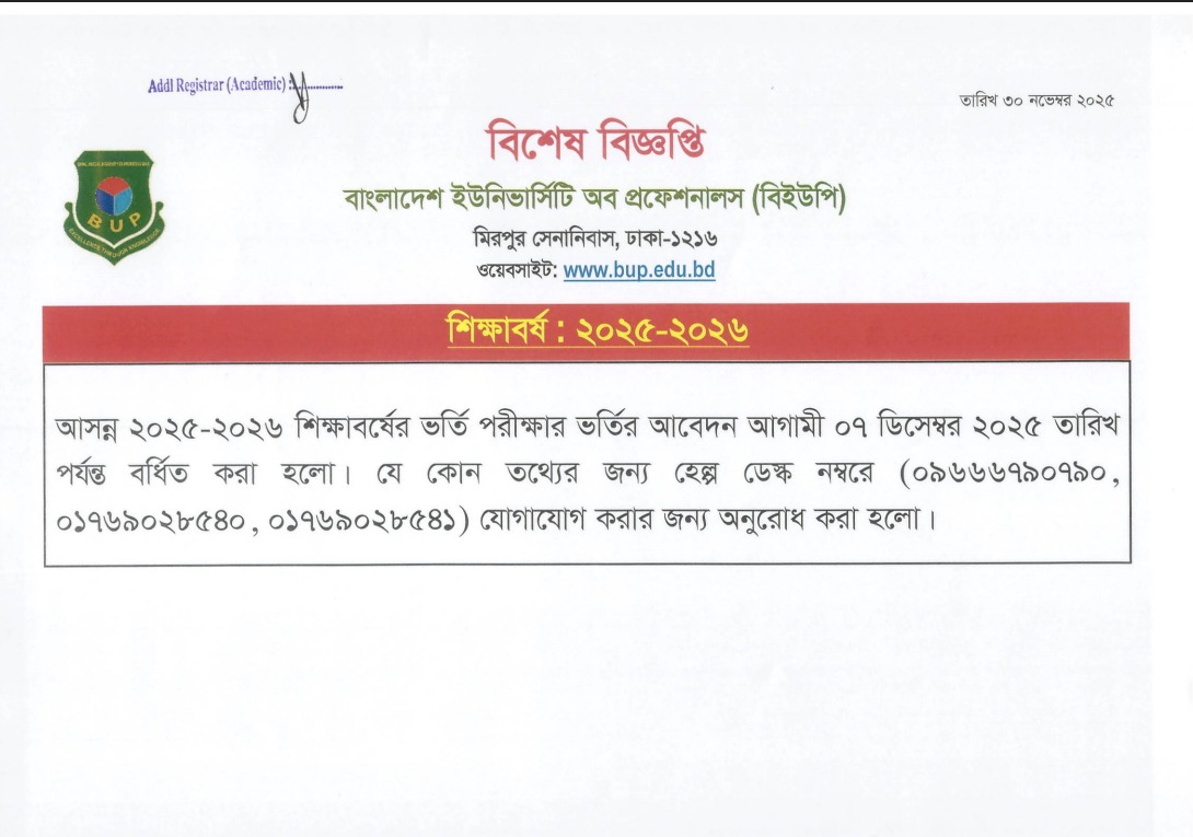 বিজ্ঞপ্তিতে বলা হয়েছে, আসন্ন ২০২৫-২০২৬ শিক্ষাবর্ষের ভর্তি পরীক্ষার ভর্তির আবেদন আগামী ০৭ ডিসেম্বর পর্যন্ত বর্ধিত করা হলো। যে কোনো তথ্যের জন্য হেল্প ডেস্ক নম্বরে (০৯৬৬৬৭৯০৭৯০,০১৭৬৯০২৮৫৪০, ০১৭৬৯০২৮৫৪১) যোগাযোগ করার জন্য অনুরোধ করা হলো।