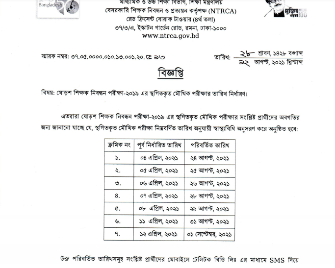 এতে আরও বলা হয়, মৌখিক পরীক্ষার প্রার্থীদের পরবর্তিতের টেলিটকের মাধ্যমে এসএমএসম পাঠানো হবে। এসএমএস পাওয়ার পর পূর্বে ডাউনলোডকৃত প্রবেশপত্র ও প্রবেশপত্রে উল্লেখিত সকল সার্টিফিকেট, এনআইডি ও মার্কসীট এর মূল কপিসহ পরিবর্তিত তারিখ অনুযায়ী মাস্ক পরিধানসহ মৌখিক পরীক্ষায় উপস্থিত থাকার জন্য অনুরোধ করা হলো।
