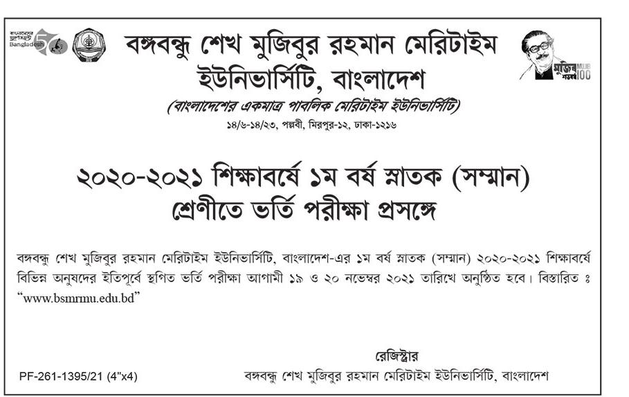আগামী ১৯ ও ২০ নভেম্বর অনুষ্ঠিত হবে করেনার কারণে স্থগিত হওয়া বঙ্গবন্ধু শেখ মুজিবুর রহমান মেরিটাইম বিশ্ববিদ্যালয়ের ২০২০-২১ শিক্ষাবর্ষের স্নাতক প্রথম বর্ষের ভর্তি পরীক্ষা ।