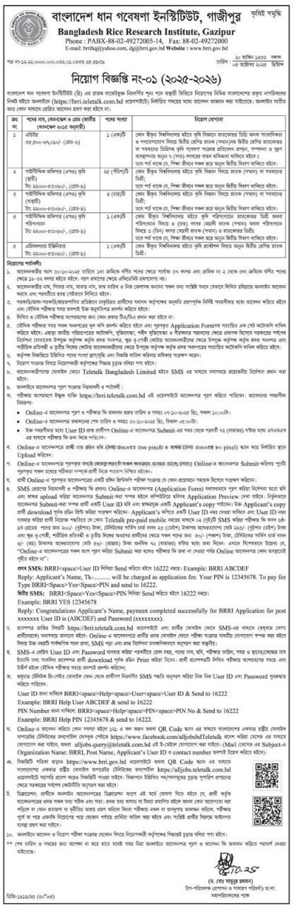 জনবল নিয়োগে বিজ্ঞপ্তি প্রকাশ করেছে বাংলাদেশ ধান গবেষণা ইনস্টিটিউট (বিআরআরআই)। প্রতিষ্ঠানটিতে ষষ্ঠ থেকে নবম গ্রেডে ৫ ক্যাটাগরির পদে ৩২ কর্মকর্তা নিয়োগে গত রবিবার (৫ অক্টোবর) বিজ্ঞপ্তি প্রকাশ করেছে। আবেদন ৭ অক্টোবর সকাল ১০টা থেকে শুরু হয়ে চলবে ৩০ অক্টোবর বিকেল ৫টা পর্যন্ত। আগ্রহী প্রার্থীরা আগামী ৩০ অক্টোবরের মধ্যে অনলাইনে আবেদন করতে পারবেন।
