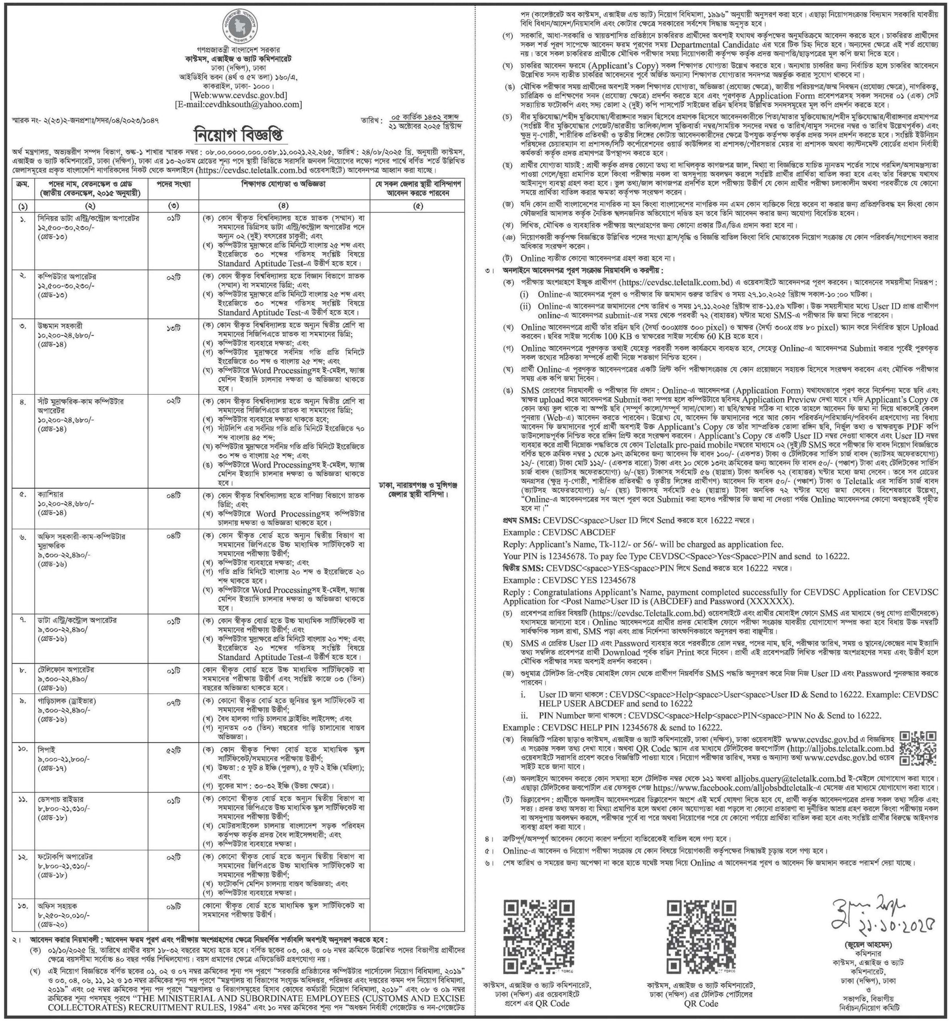 বেতন স্কেল: ৮,২৫০-২০,০১০ টাকা (গ্রেড-২০);