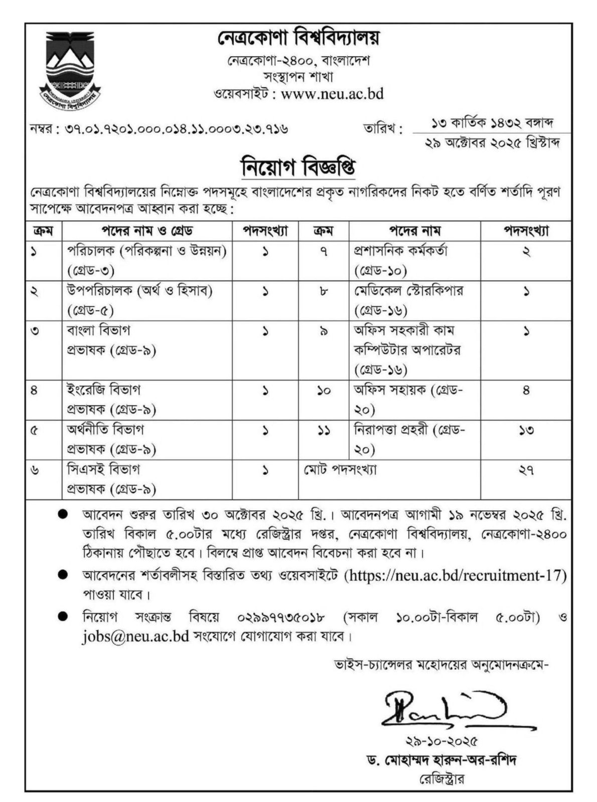 আবেদন ডাক/কুরিয়ারযোগে রেজিস্ট্রার দপ্তর, নেত্রকোণা বিশ্ববিদ্যালয়, নেত্রকোণা-২৪০০ বরাবর পাঠাতে হবে;