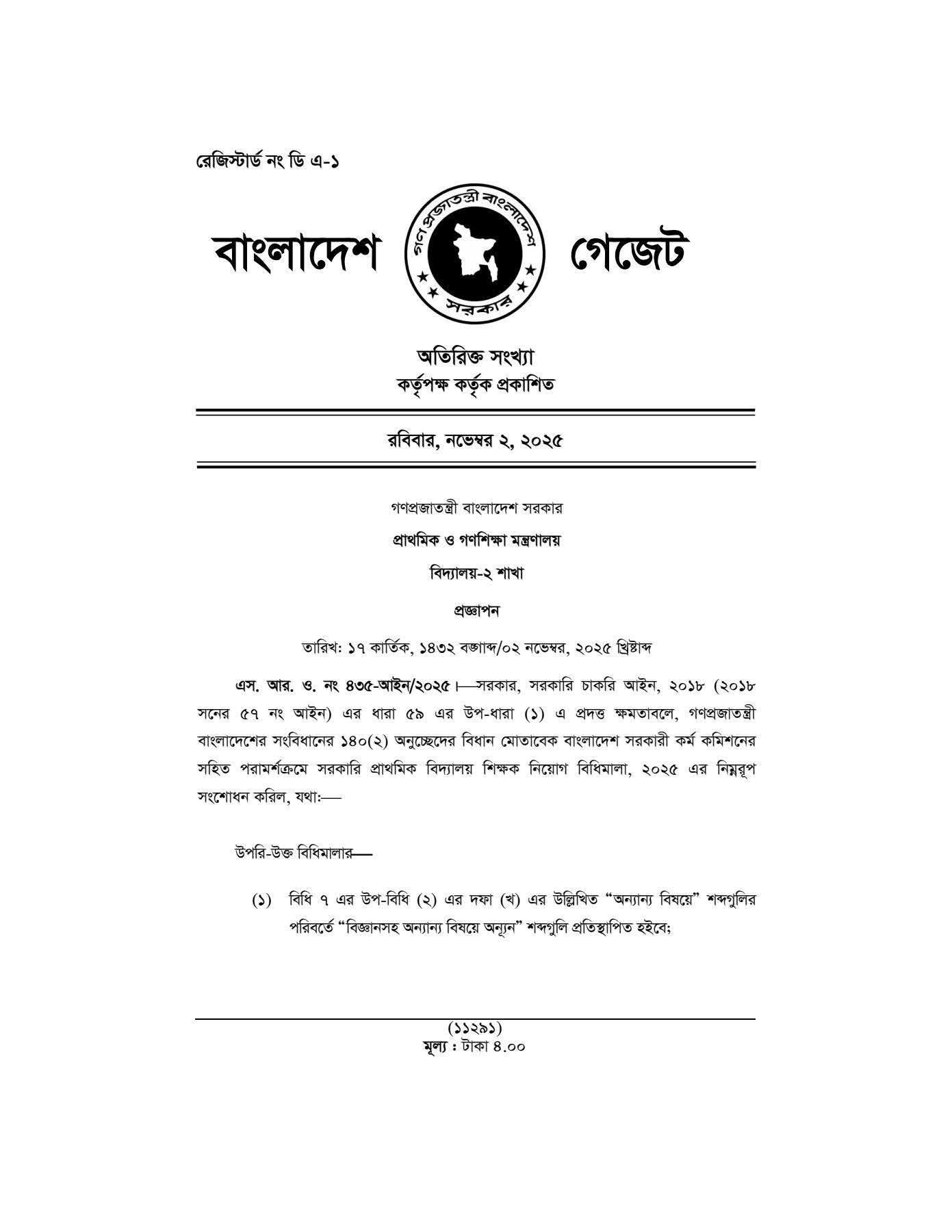 প্রাথমিক শিক্ষক নিয়োগ বিধিমালা সংশোধন, প্রজ্ঞাপন জারি