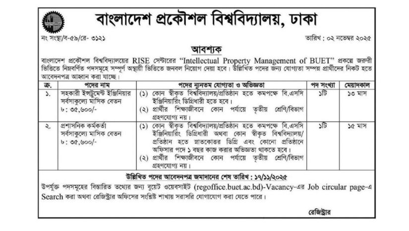 বাংলাদেশ প্রকৌশল বিশ্ববিদ্যালয় (বুয়েট) এর রাইজ (RISE) সেন্টারের “ইন্টিলেকচুয়াল প্রোপার্টি ম্যানেজমেন্ট অব বুয়েট” প্রকল্পে জরুরি ভিত্তিতে নিয়োগের জন্য বিজ্ঞপ্তি প্রকাশ করা হয়েছে। দুটি(২) পদে সম্পূর্ণ অস্থায়ী ভিত্তিতে জনবল নিয়োগ দেওয়া হবে। আগ্রহী প্রার্থীরা আগামী ১৭ নভেম্বর ২০২৫ তারিখের মধ্যে আবেদনপত্র জমা দিতে পারবেন।