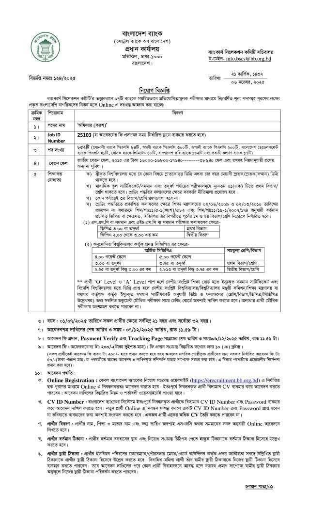 জনবল নিয়োগে বিজ্ঞপ্তি প্রকাশ করেছে বাংলাদেশ ব্যাংক। প্রতিষ্ঠানটির অধীন ব্যাংকার্স সিলেকশন কমিটির সদস্যভুক্ত ৭ ব্যাংকে ‘অফিসার (ক্যাশ)’ পদে ৮৫২ কর্মকর্তা নিয়োগ দেয়া হবে। আগ্রহী প্রার্থীরা আগামী ৭ ডিসেম্বরের মধ্যে অনলাইনে আবেদন করতে পারবেন।