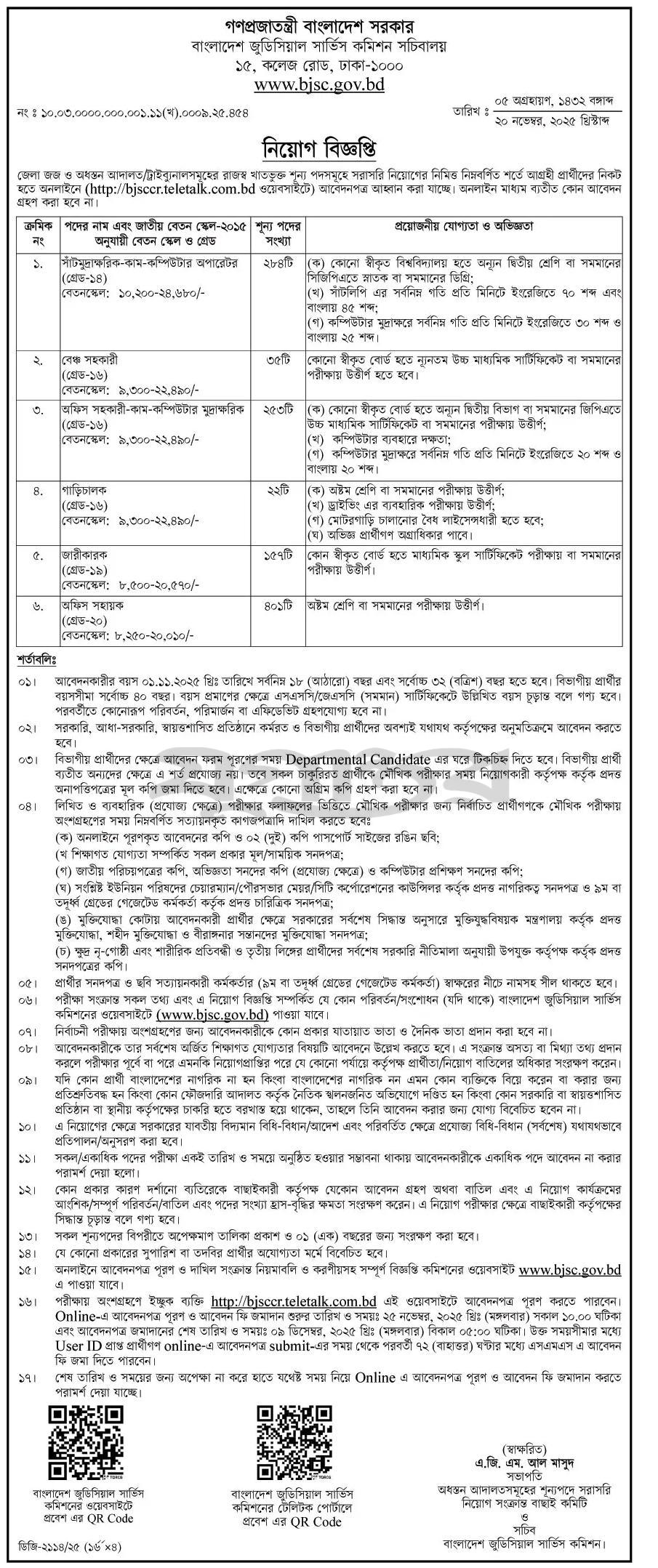জনবল নিয়োগে বিজ্ঞপ্তি প্রকাশ করেছে বাংলাদেশ জুডিশিয়াল সার্ভিস কমিশন সচিবালয়। প্রতিষ্ঠানটি ১৪ থেকে ২০তম গ্রেডে ৬ পদে ১১৫২ কর্মী নিয়োগে ২০ নভেম্বর প্রকাশ করেছে এ বিজ্ঞপ্তি। আবেদন ২৫ নভেম্বর সকাল ১০টা থেকে শুরু হয়ে চলবে ৯ ডিসেম্বর বিকেল ৫টা পর্যন্ত। আগ্রহী প্রার্থীরা আগামী ৯ ডিসেম্বরের মধ্যে অনলাইনে আবেদন করতে পারবেন।