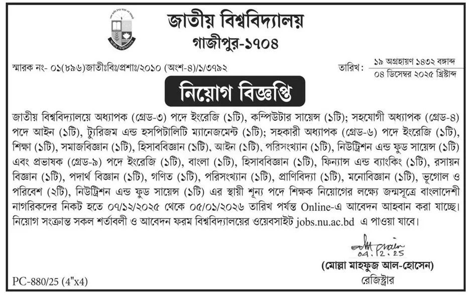আগামী ৭ ডিসেম্বর ২০২৫ থেকে ৫ জানুয়ারি ২০২৬ পর্যন্ত অনলাইনে আবেদন করা যাবে। আবেদনসহ নিয়োগসংক্রান্ত সকল শর্তাবলী জাতীয় বিশ্ববিদ্যালয়ের নির্ধারিত ওয়েবসাইটে পাওয়া যাবে।