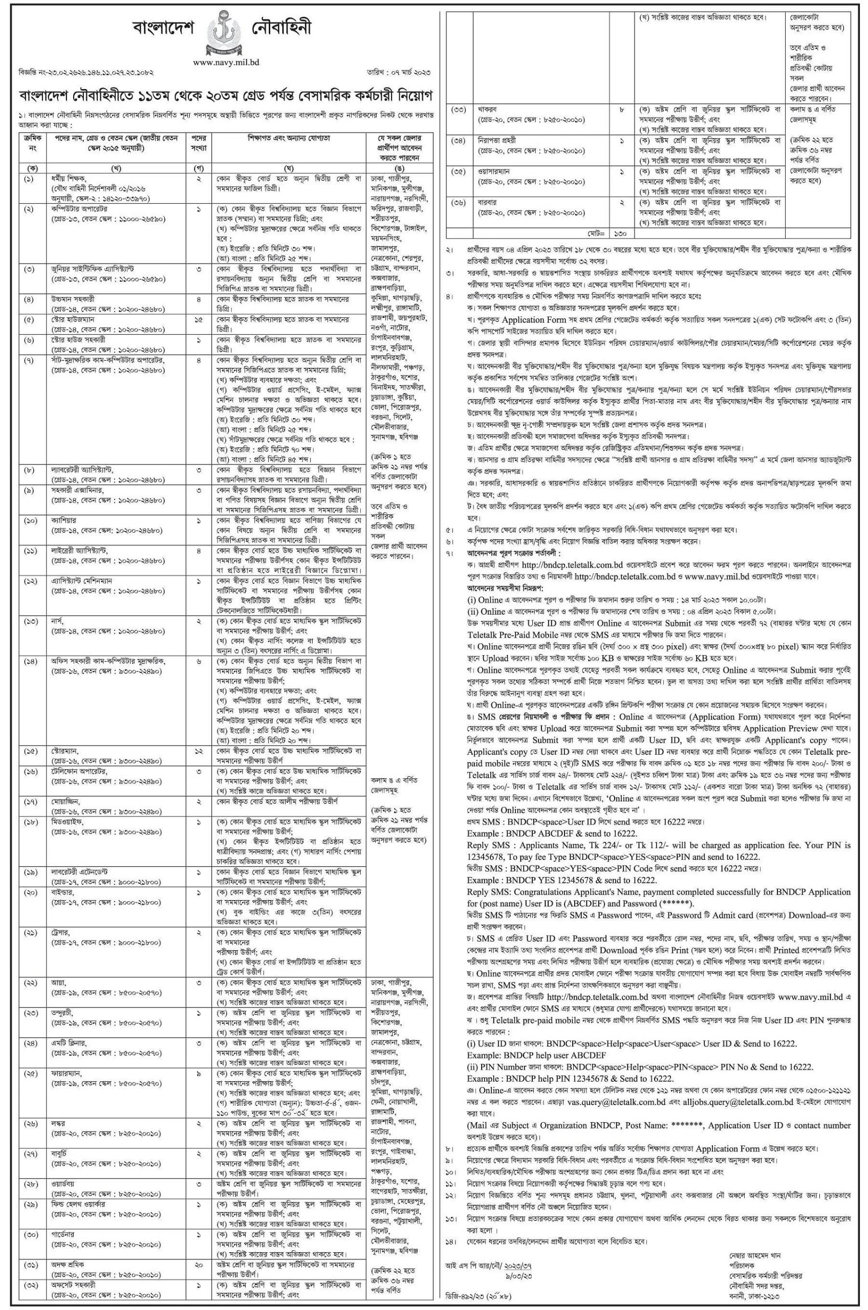 বাংলাদেশ নৌবাহিনীতে ১১তম থেকে ২০তম গ্রেড পর্যন্ত ১৩০ জন বেসামরিক কর্মচারী নিয়োগ দেয়া হবে। আগ্রহীরা আগামী ১৪ মার্চ থেকে ৪ এপ্রিল পর্যন্ত অনলাইনে আবেদন করতে পারবেন।