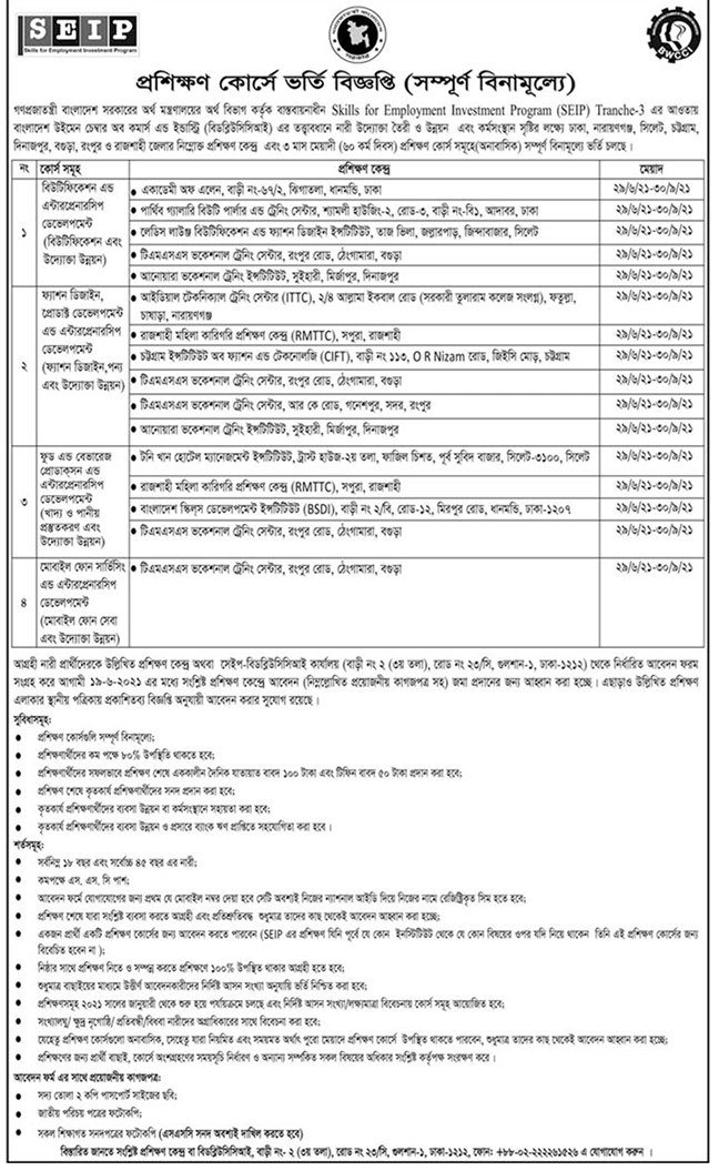 সরকারের অর্থ মন্ত্রণালয়ের অর্থ বিভাগ কর্তৃক বাস্তবায়নাধীন Skill for Employment Investment Program (SEIP) Trance-3 এর আওতায় বাংলাদেশ উইমেন চেম্বার অব কমার্স এন্ড ইন্ডাস্ট্রি এর তত্বাবধানে নারী উদ্যোক্তা তৈরি ও উন্নয়ন এবং কর্মসংস্থান সৃষ্টির লক্ষে্য ৩ মাস মেয়াদি বিনামূল্যে প্রশিক্ষণ কোর্সের ভর্তি বিজ্ঞপ্তি দেওয়া হয়েছে। ঢাকা, নারায়নগ্ঞ্জ, সিলেট, চট্টগ্রাম, দিনাজপুর, বগুড়া, রংপুর ও রাজশাহী জেলার প্রার্থীগণ আবেদন করতে পারবেন।